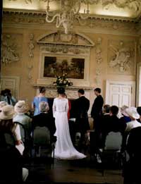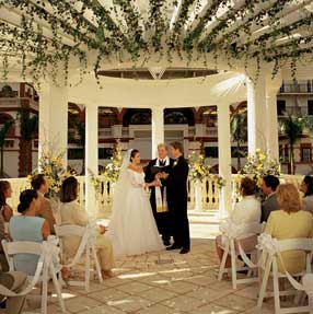 At last it's time for the wedding. Although most weddings follow long-held traditions, there's still room for American individualism. For example, the usual place for a wedding is in a church. But some people get married outdoors in a scenic2 spot. A few even have the ceremony while skydiving or riding on horseback! The couple may invite hundreds of people or just a few close friends. They choose their own style of colors, decorations and music during the ceremony. But some things rarely change. The bride usually wears a beautiful, long white wedding dress. She traditionally wears "something old, something new, something borrowed and something blue." The groom3 wears a formal suit or tuxedo4. Several close friends participate in the ceremony as attendants, including the best man and the maid of honor.