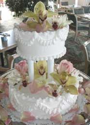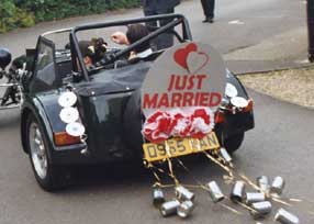 At the wedding reception, the bride and groom greet their guests. Then they cut the wedding cake and feed each other a bite. Guests mingle8 while enjoying cake, punch and other treats. Later the bride throws her bouquet9 of flowers to a group of single girls. Tradition says that the one who catches the bouquet will be the next to marry. During the reception, playful friends "decorate" the couple's car with tissue paper, tin cans and a "Just Married" sign. When the reception is over, the newlyweds run to their "decorated" car and speed off. Many couples take a honeymoon10, a one- to two-week vacation trip, to celebrate their new marriage.