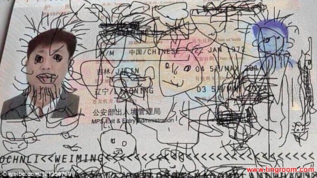 The Chinese national is now stuck in the country after border officials failed to be impressed by his young son's creative addition of people, animals, and a beard - all daubed in black felt tip - to the passport.