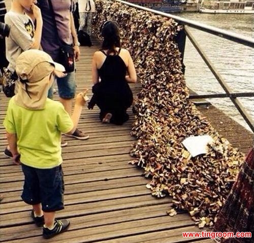 在巴黎这已经成为传统,慕名而来的游客们都会买把锁挂到桥上,然后把钥匙扔到塞纳河里。