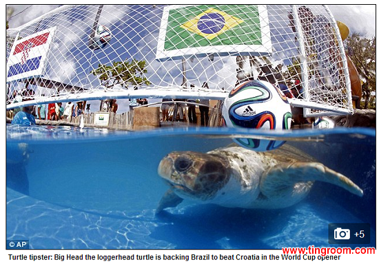 2010年南非世界杯期间,德国的章鱼保罗开启了世界杯战况动物神预测的热潮,随后世界各地都竞相模仿。今年,巴西请海龟“大头”出马,担任本届世界杯的预言帝。