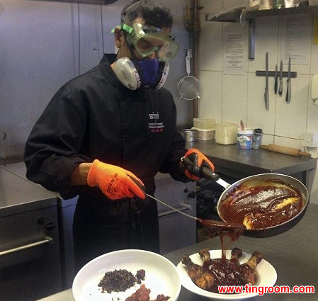 34岁的穆罕默德-卡里姆在做这道被他称为“原子踢屁屁鸡腿”的菜肴时,必须带上防毒面具才能不被蒸汽辣晕。