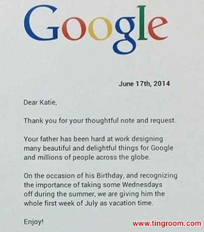 “正好赶上他过生日,同时我们也认可炎热夏天中的周三应适当放假,所以我们将给予你爸爸7月第一周一整个星期的假期。尽情享受吧!”