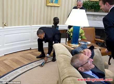 照片上,奥巴马总统用一本杂志重击入侵椭圆形办公室的苍蝇,引得一旁的幕僚们大笑。