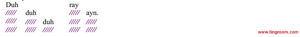 V Make rain very musical and put it on two notes: ray-ayn. Duh-duh-duh ray-ayn / It sounds like ray-ayn.