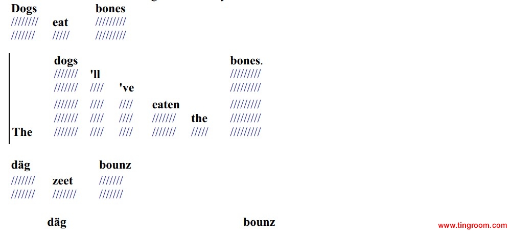 The confusing part is that in English the verb tenses are very important, but instead of putting them up on the peaks of a sentence, we throw th em all deep down in the valleys ! Therefore, two sentences with strong intonation—such as, " Dogs eat bones" and "The dogs 'll've eaten the bones" sound amazingly similar. Why? Because it takes the same amount of time to say both sentences since they have the same number of st resses. The three original words and the rhythm stay the same in these sentences, but the meaning changes as you add more stressed words. Articles and verb tense changes are usually not stressed.