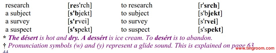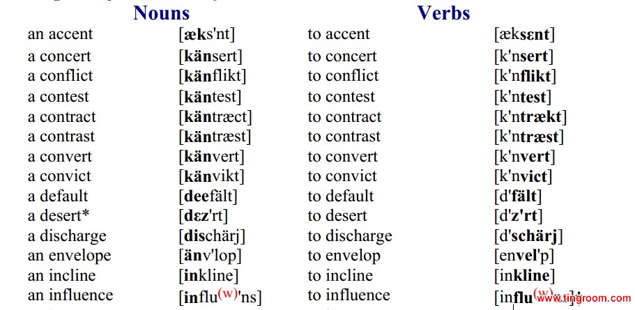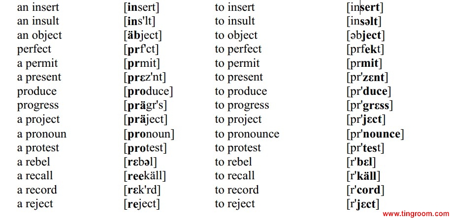 In the list below, change the stress from the first syllable1 for nouns to the second syllable for verbs. This is a regular, consistent change. Intonation2 is so powerful that you'll notice that when the stress changes, the pronunciation of the vowels3 do, too.