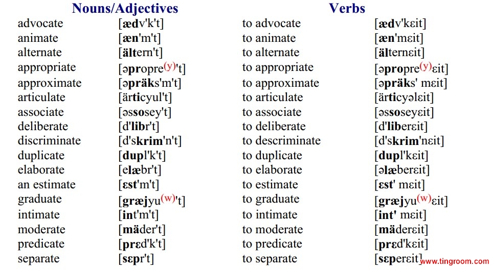 A different change occurs when you go from an adjective or a noun to a verb. The stress stays in the same place, but the -mate in an adjective is completely reduced [-m't], whereas in a verb, it is a full [a] sound [-m ε it].