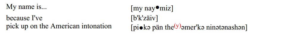 In the preceding example, the word name ends in a consonant sound [m] (the e is silent and doesn't count), and is starts with a vowel sound [i], so naymiz just naturally flows together. In because I've, the [z] sound at the end of because and the [äi] sound of I blend together smoothly4. When you say the last line [pi●kəpän the(y)ə mer'kə ninət ə nash ə n], you can feel each sound pushing into the next.