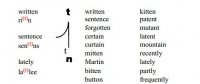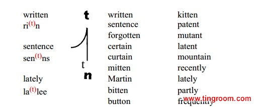 The "held T" is, strictly1 speaking, not really a T atall. Remember [t] and [n] are very close in the mouth (see Liaisons2, Exercise 2-5). If you have an N immediately after a T, you don't pop the T—the tongue is in the T position—but you release the air with the N, notthe T. There is no [t] and no [ə]. Make a special point of not letting your tongue release from the top of your mouth before you drop into the [n]; otherwise, bu(tt)onwould sound like two words: but-ton. An unstressed Tor TT followed by N is held. Read the following words and sentences out loud. Make sure that the underlined Ts are held. Remember, there is no "uh" sound before the [n].
