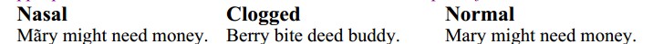 As you will see in Chapter 12, there are three nasal consonants2, m, n, and ng. These have non-nasal counterparts, m/b, n/d, ng/g. We're going to practice totally denasalizing your voice for a moment, which means turning the nasals intothe other consonants.We'll read the same sentence three times. The first will be quite nasal. The second will sound like you have a cold. The third will have appropriate nasal consonants, but denasalized vowels3. Repeat after me.