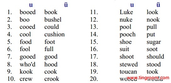 Look at the chart that follows and repeat eachword. We are contrasting the sound [u] (first column)—a strong, nonreducible sound, ooh, that is made far forward in the mouth, with the lips fully rounded—with the reduced [ü] sound in the second and fourth columns1.