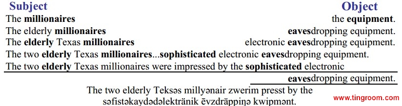 No matter how complex the verb gets, remember to follow the basic Dogs eat bones intonation1, where you stress the nouns. For the noun intonation, stick with the basic set phrase or description rule. Let's build up one complex noun for the subject, and another one for the object, starting with The millionaires were impressed by the equipment.