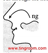 [ng] is back in the throat with[g]. The back of the tongue presses back, and again, the air comes out through the nose.