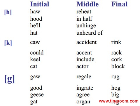There are five consonant1 sounds that are produced in the throat: [h] [k] [g] [ng] [er]. Because R can be considered a consonant, its sound is included here. For pronunciation purposes, however, elsewhere this book treats it as a semivowel.