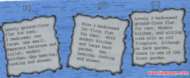 请根据对话内容,在下面(A)~(C)三则房屋出和且的广告中,选出最符合Robert 要求