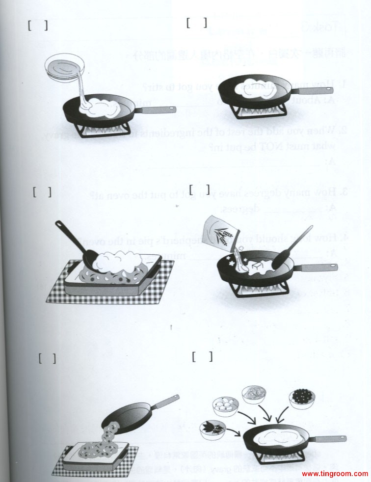 下面六张图显示出shepherd’s pie的调理方法,请根据独白的内容,按照先后顺序加以编号。