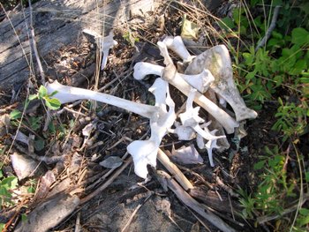Bones! What bones! I mean, what or who did they belong to? There weren't enough of them to reconstruct a complete skeleton, so my kids and I had to deduce whose they were, and what had happened. First of all, they were not human, thank goodness, so we weren't playing on a crime scene. Secondly8, one of the bones had a certain kind of fur attached to it. Conclusion, it must have been a baby deer, a foal. The poor little thing could have died in a number of ways. The area of Lake Roosevelt is quite wild, really. There are not only lots of deer, but also moose, and the occasional predators9, like coyotes. Also, the winters are very snowy, cold, and long. Unless deer come down to the human residences and eat up garden plants, their food sources can become quite limited. One of the neighbor ladies who was on the beach told me that it is difficult for the younger deer to survive the winter. Thankfully, there are so many of them, that future generations continue to thrive. But there is obviously a toll10 every year. My kids were fascinated with all of this, so they decided11 to bring the bones home. Oh great! Something else that's yucky in the house. Mind you, it could have been worse. The lady also told me that she was going for a walk one morning, and a moose walked right past her! Now, those bones would have been far too big for the car!