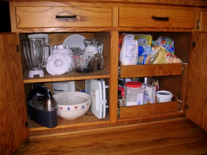 So, what do we put inside the cabinets? All sorts of things. Anything from the heavy kitchen equipment like the food processor, the blender, the juicer, the slow cooker, and the waffle maker7. Then there are the pots and pans like the frying pan, the wok8, baking dishes, and casserole dishes. If you know much about cooking, you will know that there are many other small pieces of kitchen equipment: the sieve9, the cheese grater, cake pans, the garlic crusher, and the list goes on and on. Cutlery or the silverware are stored in the various drawers, and there is usually a separate drawer for the larger kitchen cultery, such as the wooden or cooking spoons, spatulas10, carving11 or chopping knives, serving spoons and hand held whiskers. Gosh, we can certainly do a lot of cooking with all of this equipment. Of course, there is no point cooking unless we have something to put the food on. The dinner plates, side/ salad plates, dessert and cereal bowls, glasses, cups, saucers, china, and wine glasses all have to be stored in cabinets as well.