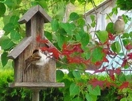 It's time that I bought a new camera. I need a digital that has a decent zoom1. I realized that the other day when I was outside, trying to get a good shot of two birds who were nesting. I had been busy throwing the ball to our dogs, when I saw a flash of white out of the corner of my eye. When I turned to see what it was, I saw a bird, obviously the male, sitting on top of the bird house, with a beak2 full of white feathers. There were so many of them, that they covered half of his body. He had seen me looking at him, and was nervously3 twitching5 his head back and forth6, waiting for an opportunity to get into the house in order to carry on with his project. The female was off to the right; she was hard to see because her coloring was so pale. I inched my way forward with the camera already in focus and zoomed7 as far as it could go. However, these smart, nervous little creatures aren't stupid. Their eyes were fixed8 on me, and they didn't go anywhere near their birdhouse entrance while I was around. They would fly off and observe me from a distant tree. So, I would back off each time and wait for them to return. This went on a few times, until I realised that I was getting nowhere. So, I did a balancing act on the edge of an outside reclining chair, whilst leaning on a wall, holding the camera around the corner towards the birds. I couldn't even see what I was taking a picture of; I just knew that I had more of a chance of getting a good shot if the birds couldn't see me. I risked my own health for the sake of art, people; I hope you appreciate it. Anyway, I got a fairly good picture of the busy parents-to-be, making the nest cosy9 for their future chicks. It was worth the danger. But next time, I'll just get a better camera.