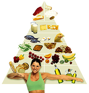 The food pyramid shows you what proportions you should have from the different food groups. The base should be carbohydrates15; bread, cereals, rice and pasta. These foods you can eat often every day. The top of the pyramid; fat, oils and nuts, are to be used sparingly, because they contain a lot of fat and calories.