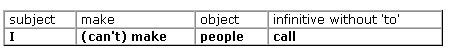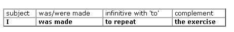 When 'make' means 'force' or 'control', in the active form, it is followed by an object and the bare infinitive3 (原形不定式/不带'to'的不定式,infinitive without 'to').