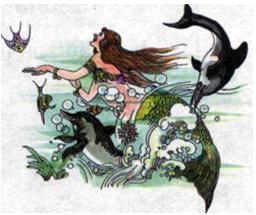 Sedna's father was so scared that he grabbed12 Sedna and threw her into the sea, screaming, "Here she is, take her." Sedna, terrified13, tried to hang on to the side of the canoe. But her father would not let her get back in. Grabbing14 his sharp knife, he cut off Sedna's fingers. As her fingers were sinking to the bottom of the ocean, they turned into seals, whales and other large sea mammals15. And Sedna, when she could no longer fight to keep herself alive, sank to the bottom too, where she became the goddess of the sea.