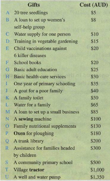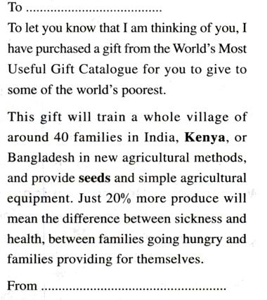 Would you like to donate an unusual gift? Then this is the catalogue1 for you. The gift you give is not something your loved one keeps but a voluntary contribution towards the lives of people who really need it. Choose from this catalogue a really useful gift for some of the world's poorest and bring hope for a better future to a community in need.