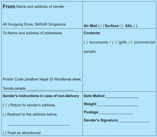 B:23 Woodlands Street, Toronto, Canada. Woodlands: W-O-O-D-L-A-N-D-S I Toronto: T-O-R-O- N -T-O