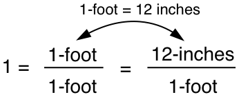 So here’s what we’re going to do: Let’s write a fraction that’s equal to the number 1. What does that look like? Well, any fraction where the numerator and denominator are the same number must equal 1. For example, 2/2 and 4/4 are both equal to 1. And that makes perfect sense since putting together 2 halves or 4 quarters of something must give a whole. Okay, how else can we make a fraction that’s equal to 1? How about something like the fraction: 1-foot / 1-foot? The numerator and denominator are the same, so even though there are units in it this fraction must equal 1 too! Okay, here comes the important part. How many inches are in 1 foot? 12 inches-per-foot, right? Indeed, which means that the fraction 12-inches / 1-foot is equal to 1!