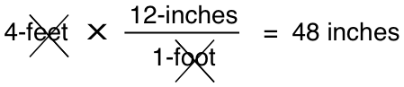 Now this is getting interesting. Since 1 is equal to the fraction 12-inches / 1-foot, and the multiplicative identity property says that we can multiply any number by 1 without changing its size, that means we can multiply the height of your little brother, 4 feet, by the fraction 12-inches / 1-foot to get his height in inches. In other words, let’s write the problem as 4-feet times the fraction 12-inches / 1-foot.