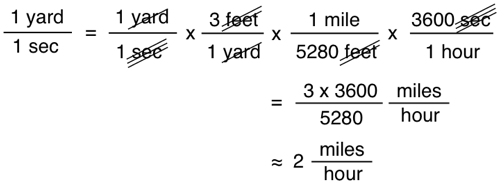 Of course we can—we just need to use a little unit conversion4 magic. So, our problem is to convert 1 yard-per-second into some number of miles-per-hour. Which means that we need to convert the distance units in the numerator from yards into miles, and we also need to convert the time units in the denominator from seconds into hours. What do we know about the connection between these units? For distances we know (or we asked Google to tell us) that there are 3 feet-per-yard and 5,280 feet-per-mile. And for time we know that there are 3,600 seconds-per-hour (that’s 60 seconds-per-minute x 60 minutes-per-hour). Combining these together, we find that