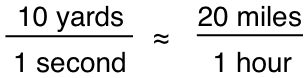 Okay, but 1 yard-per-second is more like a walking pace—it’s definitely slower than players run. A more reasonable case might be that you watch a player run 10 yards—from the 30 to the 40 yard line—in one second. So how fast would that be? Well, all we have to do is multiply 2 miles-per-hour by 10 (since the player is now moving 10 times farther in that same 1 second time period).