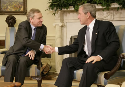Since August 2003, the American economy has created more than 6.6 million new jobs, including over 1.7 million jobs in the past 12 months alone. Real take-home wages are up by 2.2 percent over the past year, which means an extra $1,300 for the typical family of four with two wage earners. And the economic growth spurred by tax cuts has helped reduce the deficit. Tax revenues have soared as the economy has grown, allowing us to meet our goal of cutting the federal deficit in half -- three years ahead of schedule.