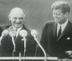I am proud to come to this city as the guest of your distinguished1 Mayor, who has symbolized2 throughout the world the fighting spirit of West Berlin. And I am proud -- And I am proud to visit the Federal Republic with your distinguished Chancellor3 who for so many years has committed Germany to democracy and freedom and progress, and to come here in the company of my fellow American, General Clay, who --