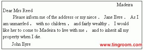 'Are you Jane Eyre?'she asked.Her face,although deathly pale,was as stern20 as ever,and she removed her hand from mine.'That child was more trouble to me than anyone would believe!I was glad to send her to Lowood.And John!Poor John!He needs so much money!Where can I get more money from?What will happen? She seemed very confused21 and excited,so I left her to sleep.