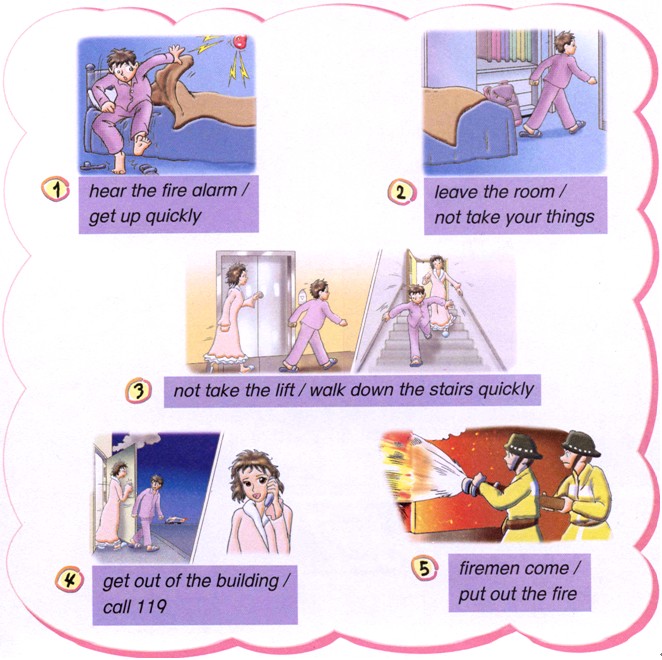 Fireman: A fire can happen when you're sleeping at home. When you hear the fire alarm, get up quickly. When you / they ... don't... You should ...