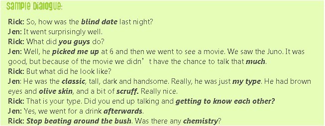 Jen just went on a blind date and Rick tries to find out all the details. A blind date means that Jen and Rick did not know each other before. Learn how to talk about love in this episode1. Were there sparks? Was there chemistry? This episode also features the expression to beat around the bush.