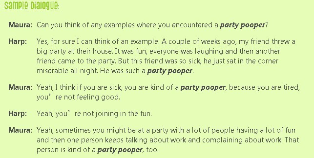 Do you like to go to parties? Are there usually any party poopers? A party pooper is someone who is not having fun and does not create more fun. Another expression that we talk about is a wet blanket. That doesn’t sound like very much fun does it? How about a stick in the mud1? We hope your party doesn’t have one of those!