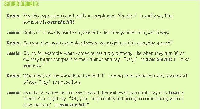 This expression is a funny way of saying that someone is old. To be over the hill means that someone is old, and so not able to do things that they used to do. You might see this expression on birthday cards or hear it in movies. This expression is usually used in a joking way. We also look at the expressions to be no spring chicken and long in the tooth. In a more positive way we also look at the golden years or the golden age. Getting older can have a lot of benefits too!