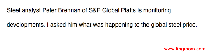翻译:来自标准普尔全球普氏的钢铁业分析人士Peter Brennan一直在关注事情的进展。我向他提问了全球钢铁价格的最新动向。