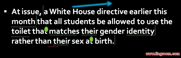 模仿句子:At issue, a White House directive earlier this month that all students be allowed to use the toilet that matches their gender1 identity rather than their sex at birth.