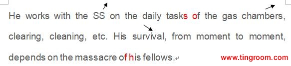 模仿句子:He works with the SS on the daily tasks of the gas chambers1, clearing, cleaning, etc. His survival, from moment to moment, depends on the massacre2 of his fellows.