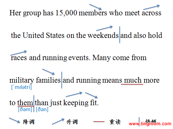 翻译:她的团队有1万5千名来自美国各地的成员,他们周末碰面,举办竞赛和跑步活动。对于其中许多来自军人家庭的人来说,跑步有比强身健体更多的意义。
