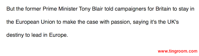 翻译:但英国前首相布莱尔则鼓励反对脱欧的活动人士有力反驳,认为英国的最终命运就是领导欧洲。
