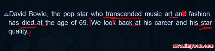 模仿句子:David Bowie, the pop star who transcended1 music art and fashion, has died at the age of 69. We look back at his career and his star quality.