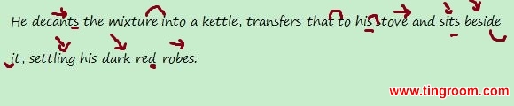 the mixture into a kettle, transfers that to his stove and sits beside it, settling his dark red robes.