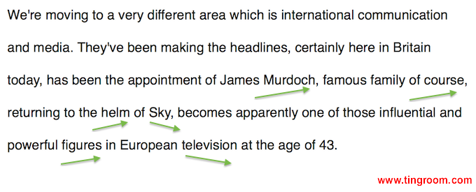 翻译:我们要转向一个完全不同的话题,那就是国际通信和媒体,这两个都上了今天英国的头条新闻。来自著名的默多克家族的James Murdoch上任,回到了天空广播公司,也在43岁之时成为了欧洲最具影响力的权力人物之一。