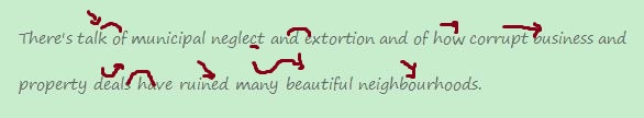There's talk of municipal neglect and extortion and of how corrupt1 business and property deals have ruined many beautiful neighbourhoods.