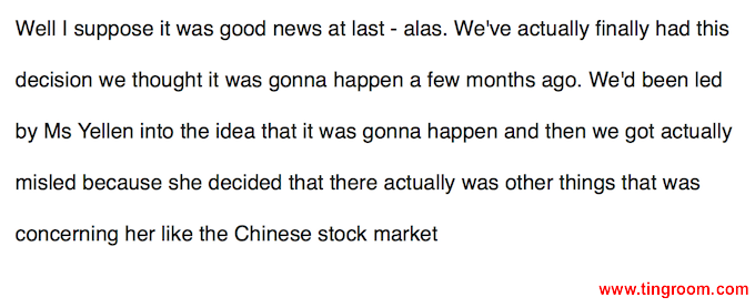 翻译:我觉得终于算是有点好消息了。我们终于等到这个期待了数月的决定了。美联储主席耶伦女士一直让我们有种这事儿要成的感觉,结果我们是被误导了,耶伦已经说她其实是在关心其他问题,比如中国股市什么的。